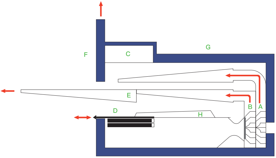 ● A-B 上下風道氣流量單獨設定,在操作臺可方便地調整和調節織物在烘房內的平衡 ● C 內置排風系統 ● D 過濾網可抽出清潔 ● E 噴咀易抽出清潔 ● F 氣動升降門 ● G 150mm厚的隔熱門板,保溫性能高 ● H 配備空氣導流板,烘箱內氣流更均勻